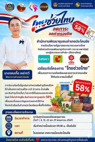 สำนักงานพัฒนาชุมชนอำเภอประโคนชัย จังหวัดบุรีรัมย์ ขอเชิญชวนประชาชนเข้าร่วมโครงการ “ไทยช่วยไทย ลดภาระค่าครองชีพ” เพื่อบรรเทาความเดือดร้อนด้านค่าครองชีพ และยกระดับคุณภาพชีวิตของประชาชนในพื้นที่ ภายในงานมีการนำสินค้าราคาประหยัดจากผู้ค้าส่งและค้าปลีกสมัยใหม่ ได้แก่ Lotus’s บิ๊กซี และทวีกิจอำเภอประโคนชัย รวมถึงสินค้าอุปโภคบริโภคที่มีคุณภาพ มาจำหน่ายในรูปแบบ “บริการถึงที่ ใกล้ชิดประชาชน” นอกจากนี้ ยังมีสินค้าชุมชน OTOP และผลิตภัณฑ์โคก หนอง นา จากผู้ผลิตในพื้นที่ที่คัดสรรมาอย่างดี เพื่อให้ประชาชนได้เลือกซื้อสินค้าในราคาย่อมเยา โครงการเริ่มตั้งแต่วันศุกร์ที่ 1 พฤษภาคม 2569 ทุกวันศุกร์ตลอดเดือน พ.ค.69